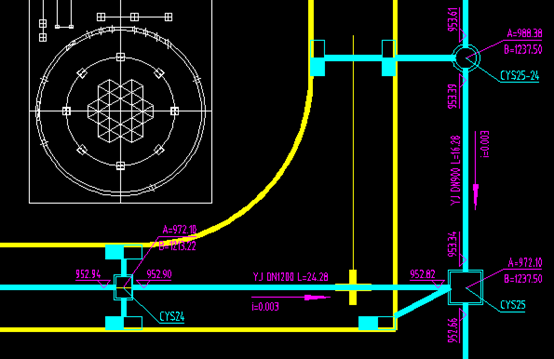 雨水管道平面布置图如图所示,程序在AutoCAD中直接绘制符合给水排水管道出图习惯的平面布置图,标注管道规格、坡度和高程,标注检查井坐标和编号,绘制检查井型号尺寸表、管道材料表,自动选择适用的图框。