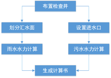 排水管道设计包含雨水排水管道设计和污水排水管道设计,主要设计流程如图所示。首先布置检查井,雨水管网通过划分汇水面计算检查井节点流量,污水管道需要设置进水口流量,然后进行管网水力计算,生成计算书。