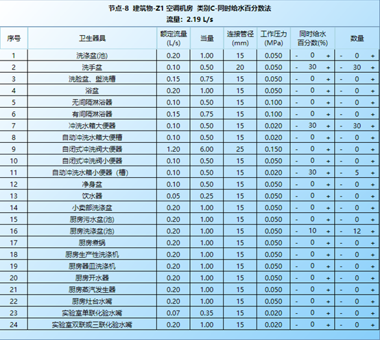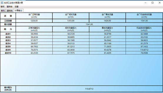 系统将厂区生活给水与工业给水计算集成为一个工具,实现了建筑物类别与给水参数设置、生活给水接口管道卫生器具设计流量计算、工业给水流量输入、管段流量和阻力计算、管网计算输出等功能。工业给水计算实现了全厂管段正常流量、非经常流量、事故流量和机组启动流量校验计算。