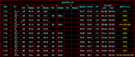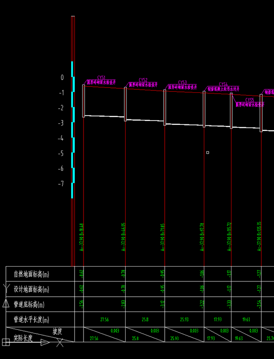 雨水管道纵断面图如所示,程序在AutoCAD中直接绘制符合给水排水管道出图习惯的纵断面图,生成管道纵断面信息表。
