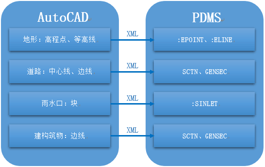工厂设计中厂区给水排水管道设计必须参考总图专业的总平面布置图,而现阶段总图专业大多没有在PDMS中进行三维总平设计,不能与其它专业实现三维协同设计。为解决这一难题,本系统实现从AutoCAD中读取总图数据并导入PDMS的功能。